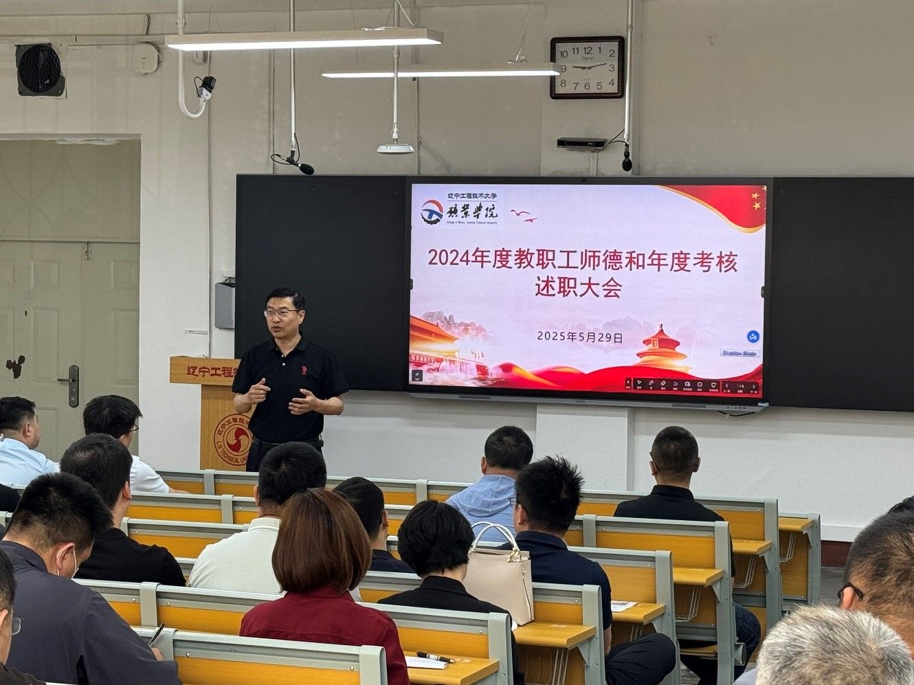 召开2024年度教职工师德和年度考核述职大会。会议由党委书记于海军主持,学院领导班子成员及全体教职工参加会议。