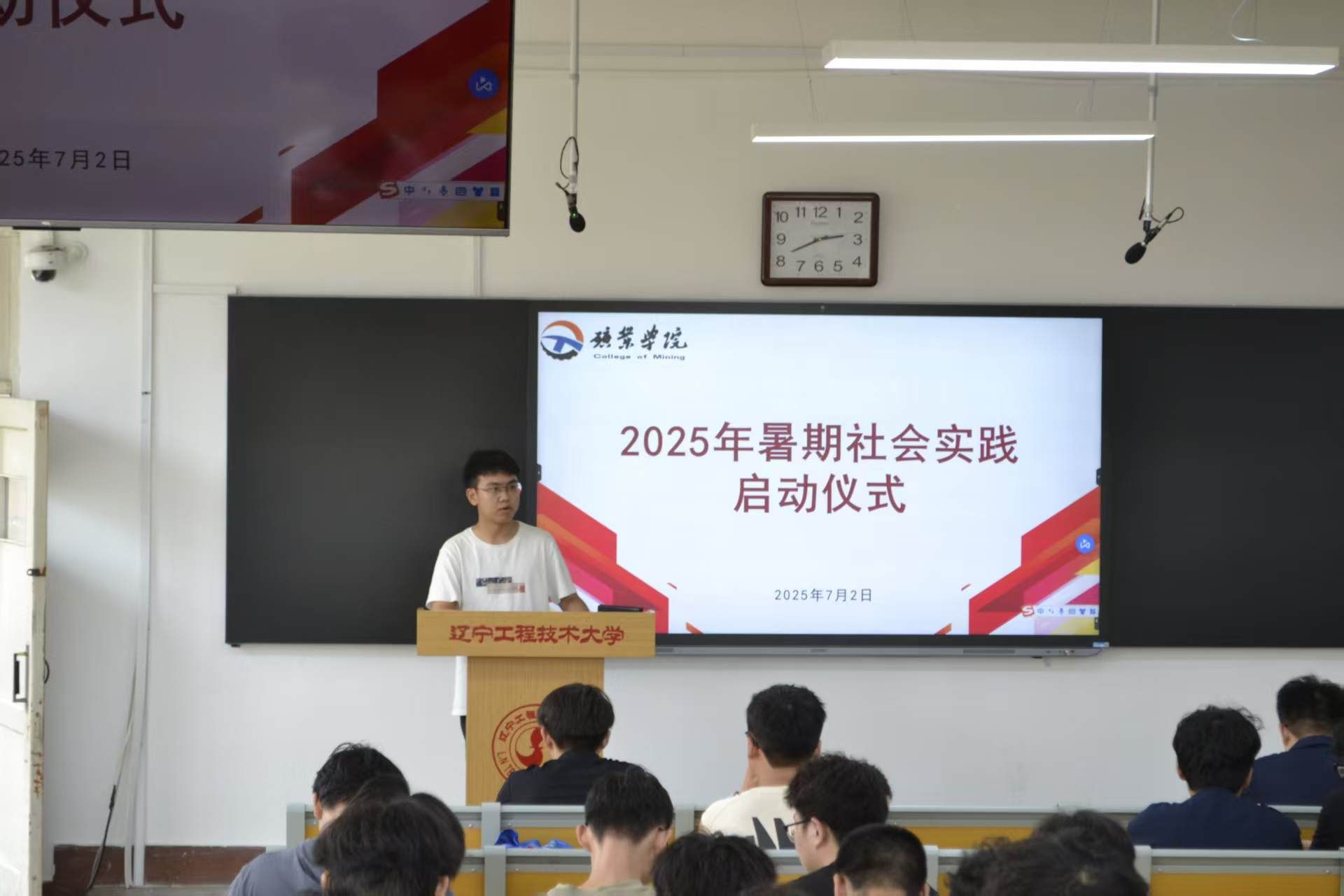 仪式上,蒋来老师首先宣读了 2025 年暑期社会实践校级及院级重点团队名单,明确各团队实践方向与任务。结合2025年实践部署,他对全体参与同学提出三点要求:一是以学铸魂,淬炼信仰根基。深入基层群众,感悟思想伟力,将“小我”融入“大我”,把青春写在祖国大地上。二是以践强能,锻造硬核本领。在乡村振兴一线“自找苦吃”,运用专业知识解决实际问题,做到学用结合、知行合一。三是以创增效,扩大实践声量。形成可推广的调研成果,通过新媒体讲好青春故事,提升影响力。