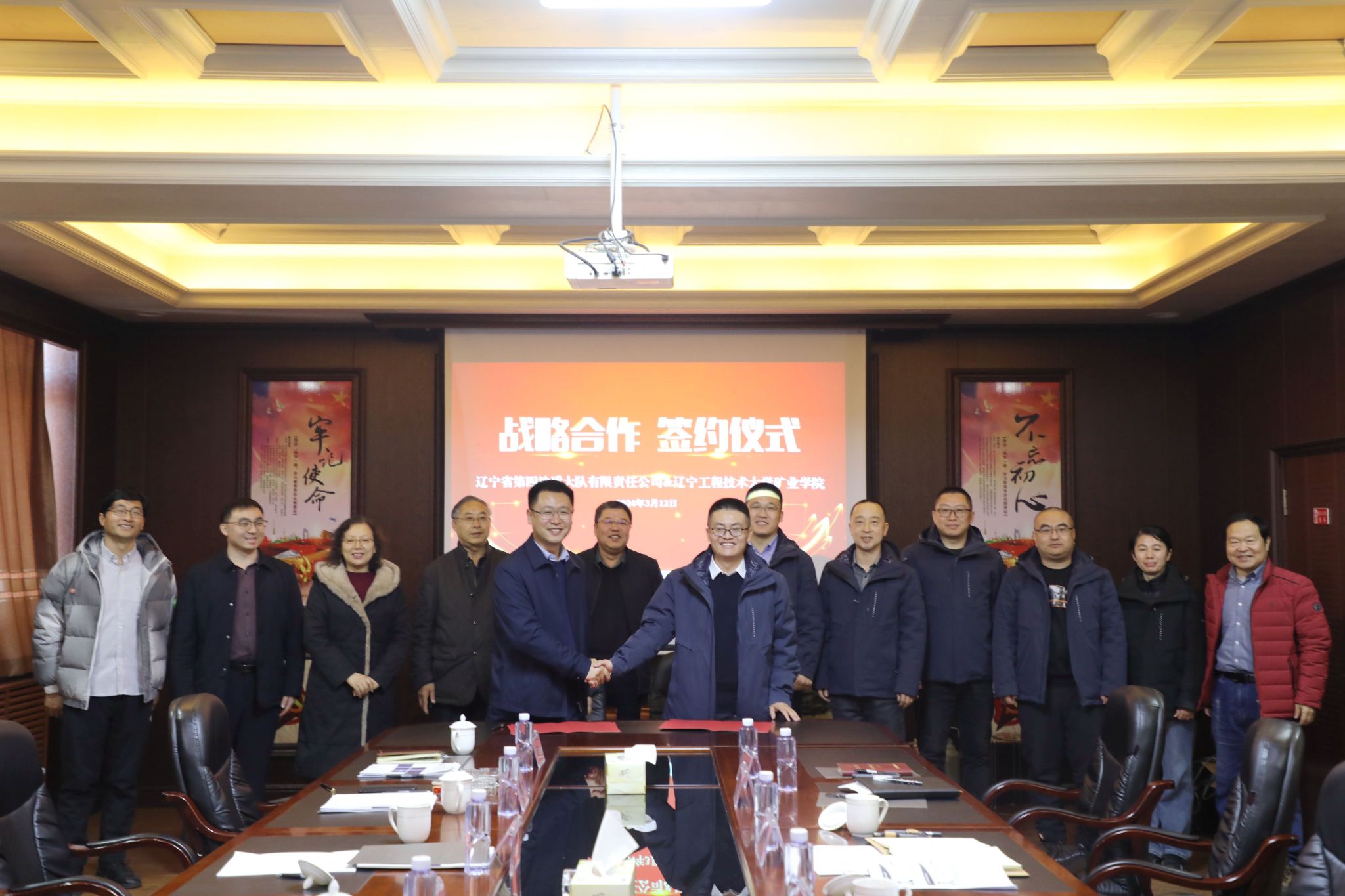 和辽宁省第四地质大队有限责任公司举行了产学研合作基地挂牌仪式并签署了战略合作协议。王东院长与第四地质大队有限责任公司党总支书记、总经理耿树峰共同挂牌,赵忠海副院长与第四地质大队副总经理于孔超代表双方签署了战略合作协议。