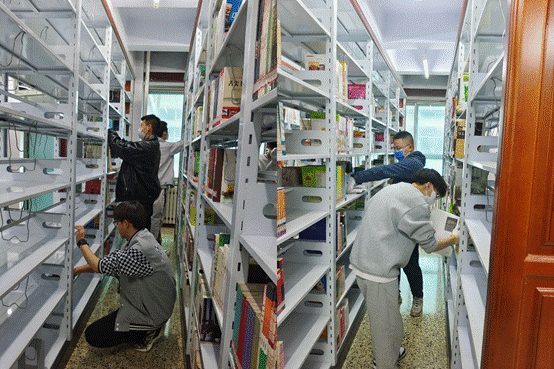学生志愿者分组到图书馆各库房进行清洁书架、运输书籍、书籍倒架、移架等工作。图书馆的书籍门类众多,纷繁复杂。工作伊始,志愿者在图书馆老师的指导下认真学习工作细则,接受专业的培训后随即投入到工作当中。志愿者们分组协作,密切配合,以敬业专注的工作态度和饱满的精神状态在负责区域内做好志愿服务工作,为全校同学能在更加整洁明亮的图书馆中借阅书籍贡献自己的力量。